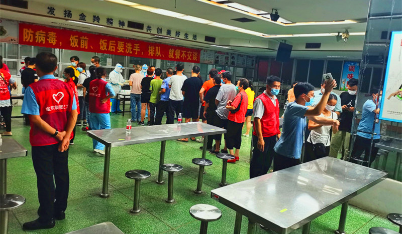 疫情就是命令,防控就是责任。在收到新中社区的核酸检测通知后,金羚集团第一时间响应,动员党员当先锋作表率,积极投身疫情防控工作,切实为群众办实事。领导班子更是闻令而动、冲锋在前,我是党员,我先上,党员干部纷纷踊跃报名参加,短时间内就集结了几支党员队伍从早上8点到晚上11点,支援新中社区和厂内核酸检测点。党员义工在检测现场协助社区义工登记信息、帮助市民扫码登记、维护现场秩序,疏导人群指引排队,切实保障核酸检测工作顺利、有序进行。